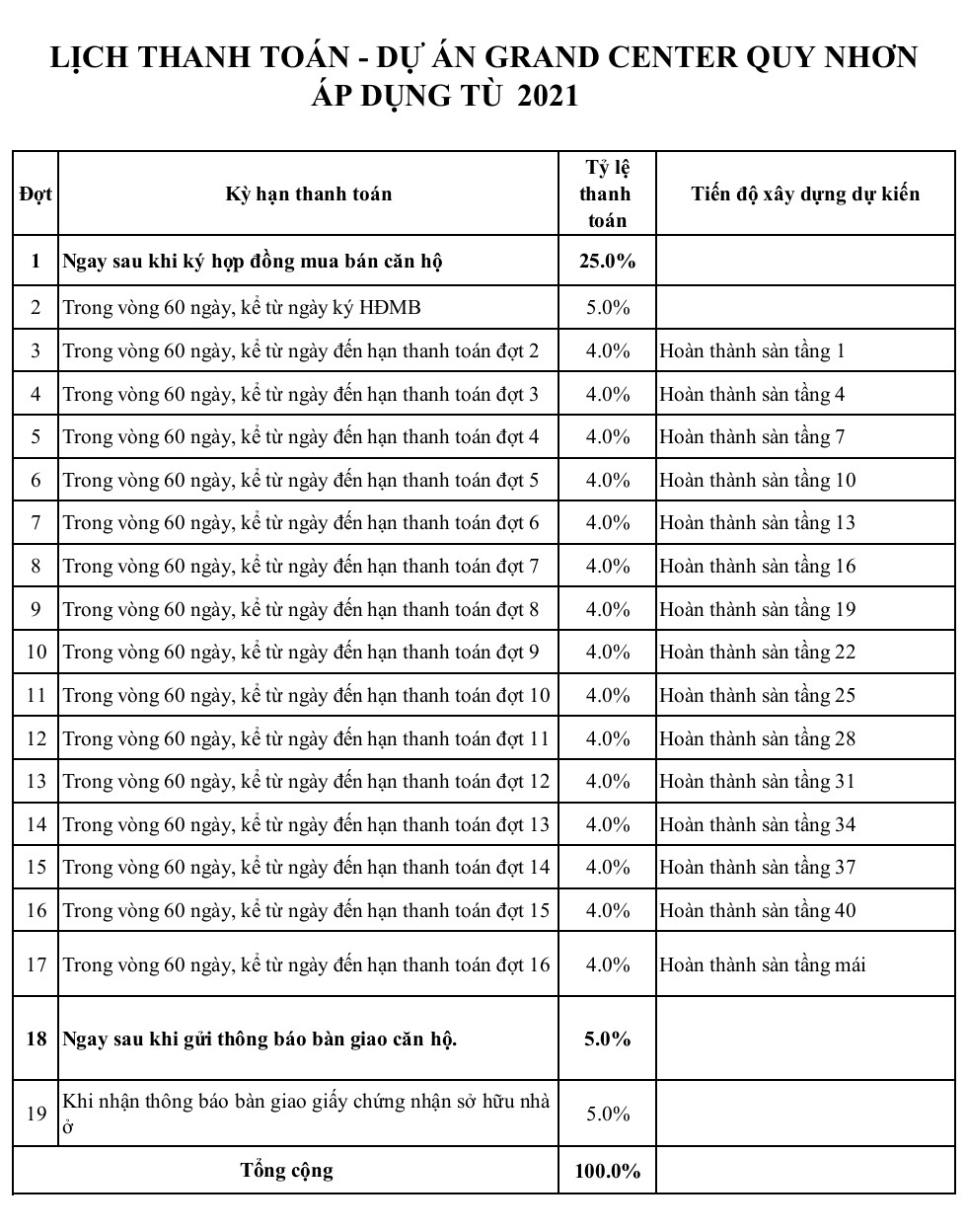 Tiến độ thanh toán đang áp dụng tại căn hộ Grand Center
